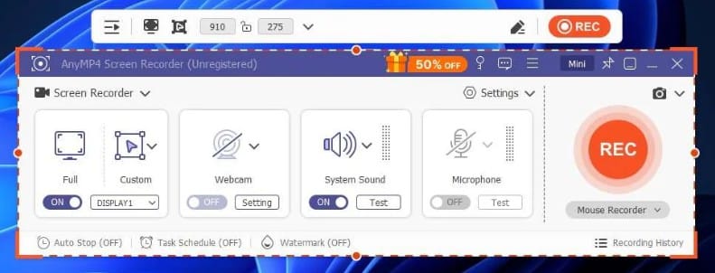 AnyMP4 Screen Recorder هو برنامج متخصص في تسجيل الشاشة والفيديو والصوت على أجهزة ويندوز بجودة عالية، مع دعم كامل لالتقاط الشاشة الكاملة أو جزء منها، وتسجيل من الميكروفون أو صوت النظام أو كلاهما. كما يتيح التقاط كاميرا الويب وتصوير الاجتماعات والمحاضرات والألعاب بدون قيود على الدقة أو الوقت في النسخة المدفوعة.