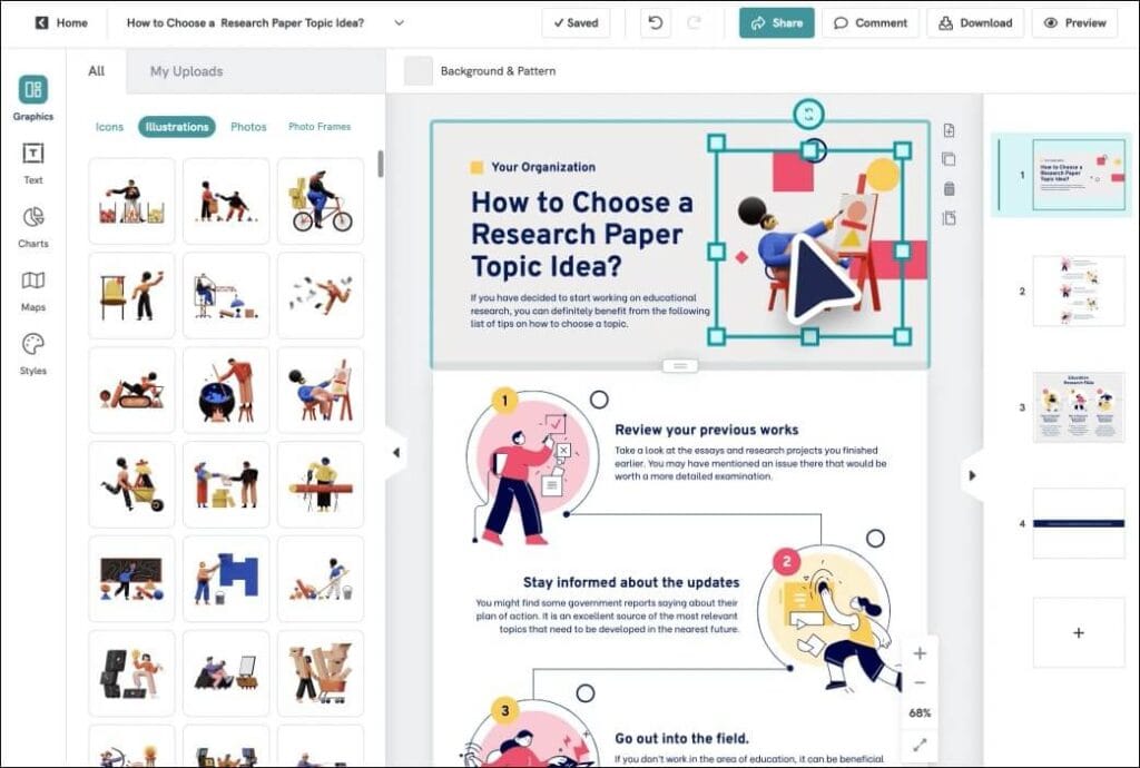 هذا هو المجال الذي ولدت فيه Piktochart وتألقت. سواء كانت لديك بيانات من دراسة سوق، أو تريد شرح خطوات عملية معينة، أو عرض التسلسل الزمني لتطور شركتك، يمكنك تحويل كل ذلك إلى انفوجرافيك جذاب بصريًا.