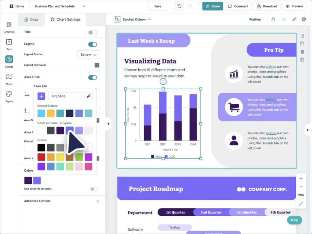 - Infogram: كما يوحي اسمه، هذا هو ملك “تصور البيانات”. إذا كان عملك يعتمد بشكل أساسي على الرسوم البيانية المعقدة والمخططات والخرائط التفاعلية، فإن Infogram يقدم خيارات تخصيص وتحليل للبيانات لا تضاهيها الأدوات الأخرى.